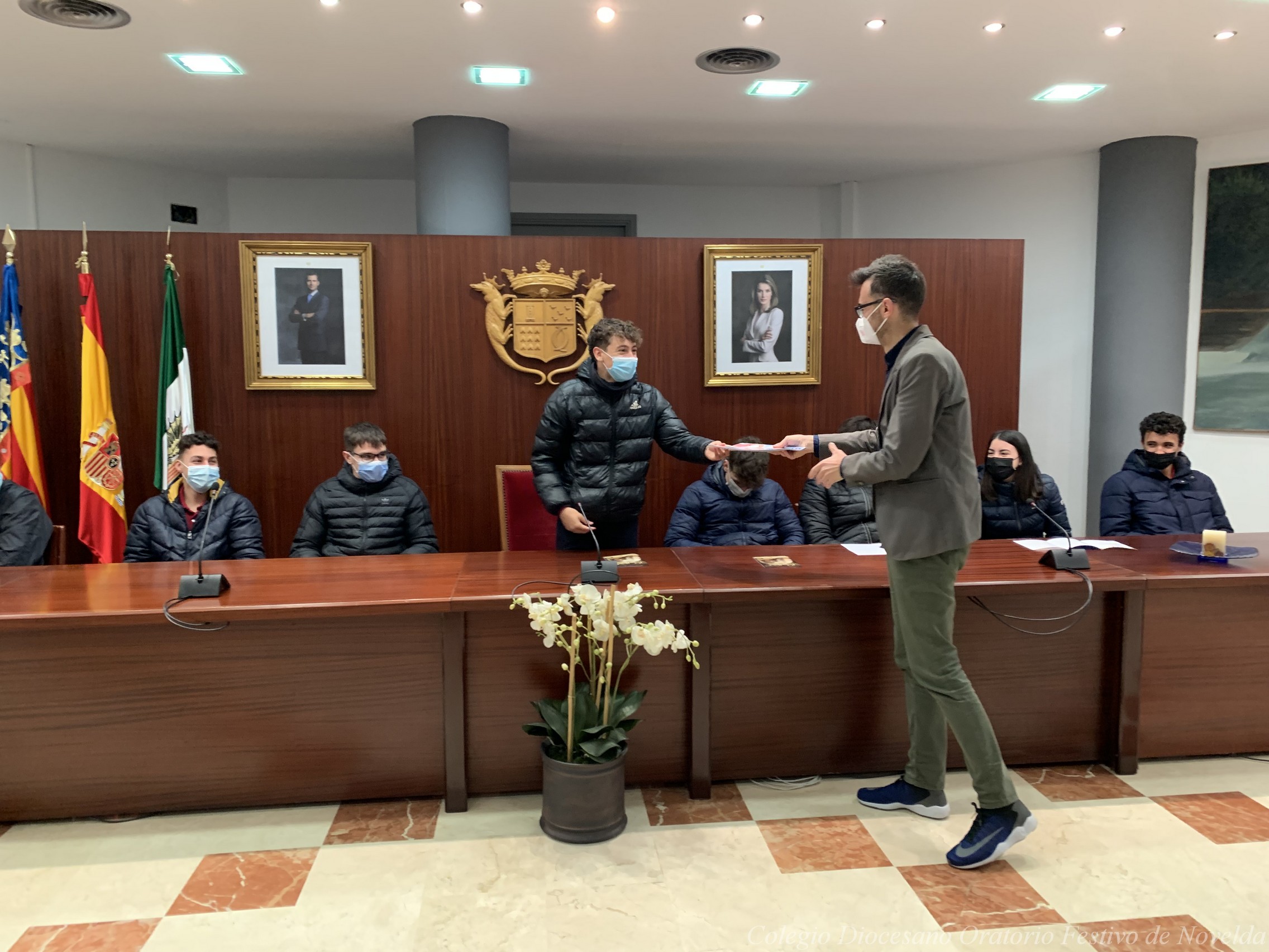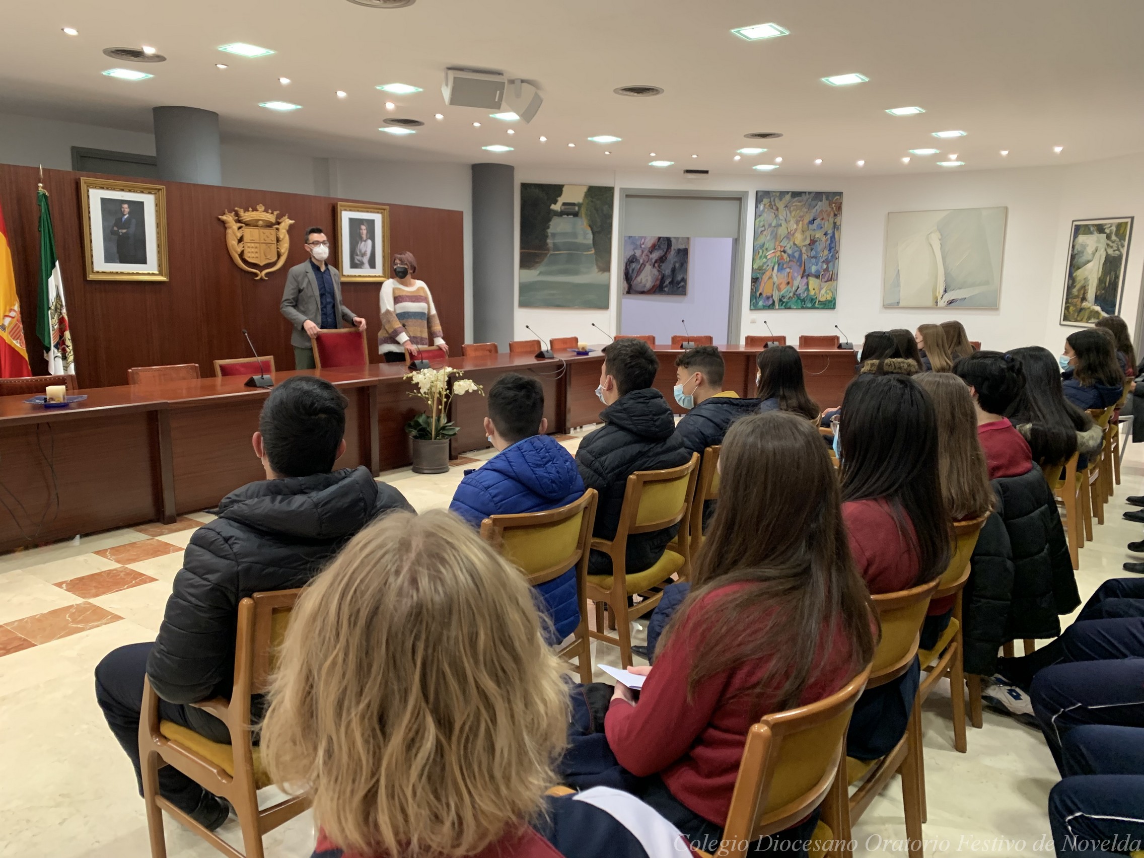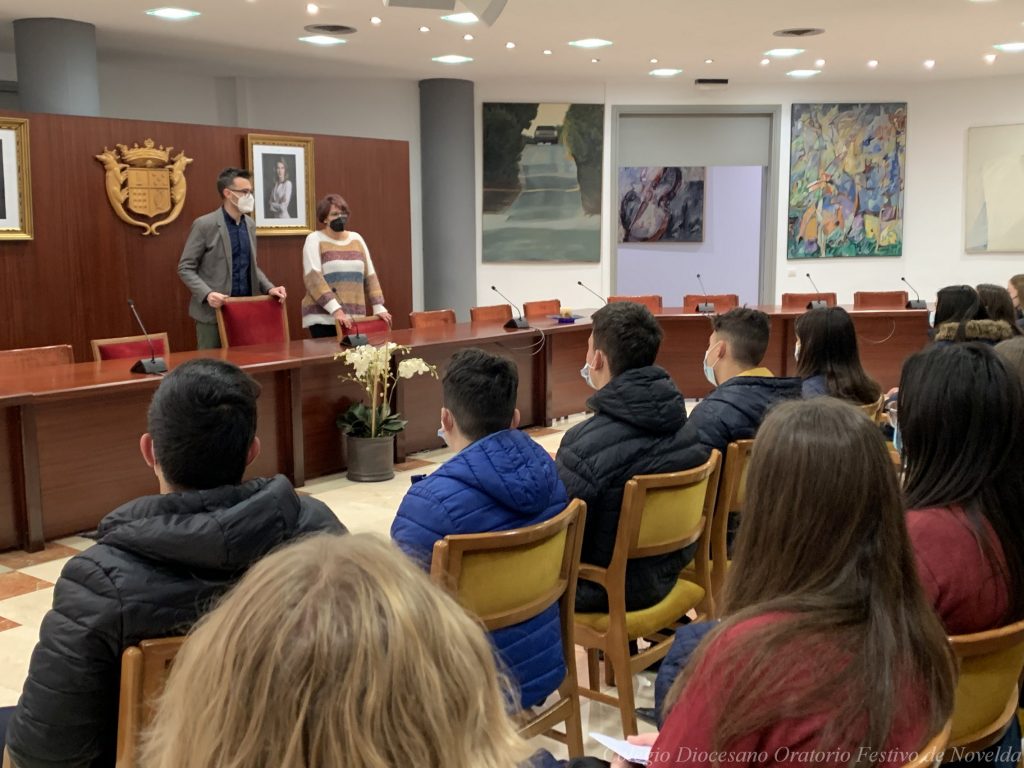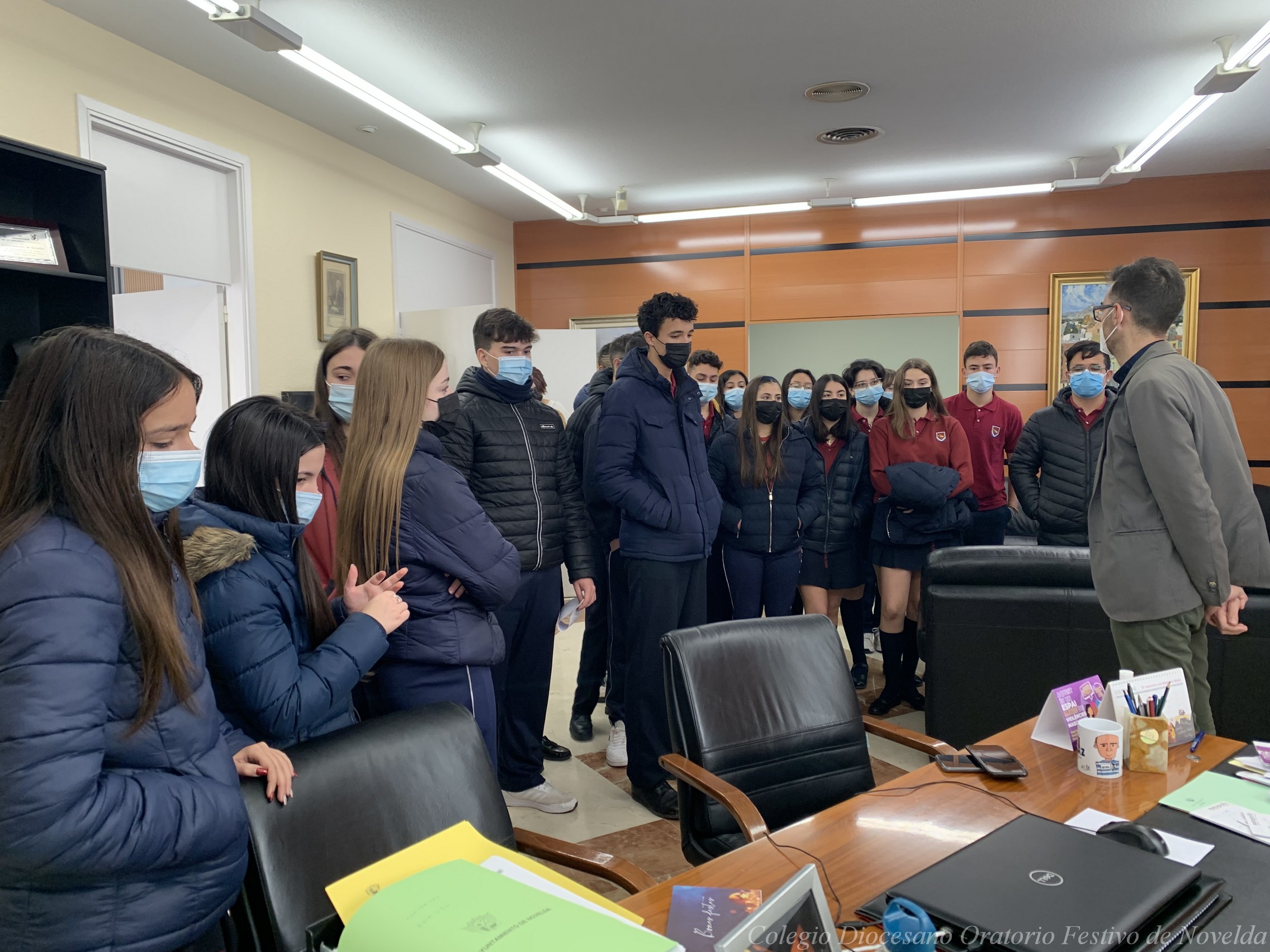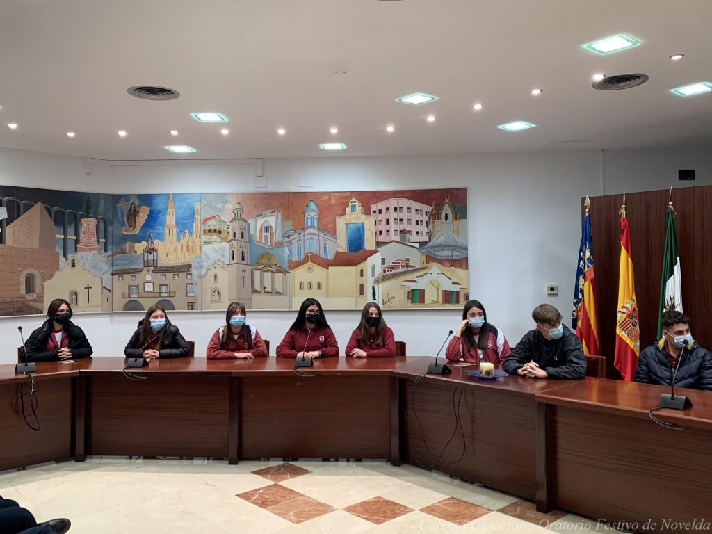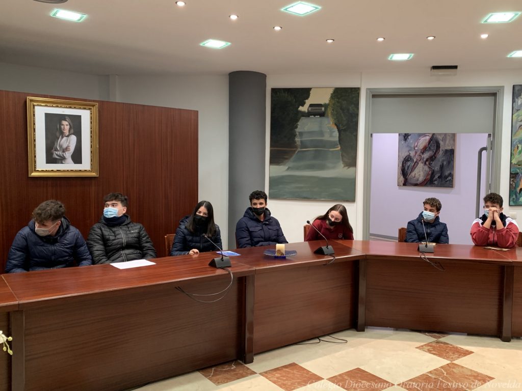 Los alumnos y alumnas de 4º ESO del colegio acaban de visitar al Alcalde de Novelda, D. Francisco Martínez. El Sr. Alcalde les ha enseñado el despacho en el que trabaja y el Salón de Plenos, pero además los escolares también han tenido la oportunidad de conocer cómo funciona el sistema electoral y el Ayuntamiento.