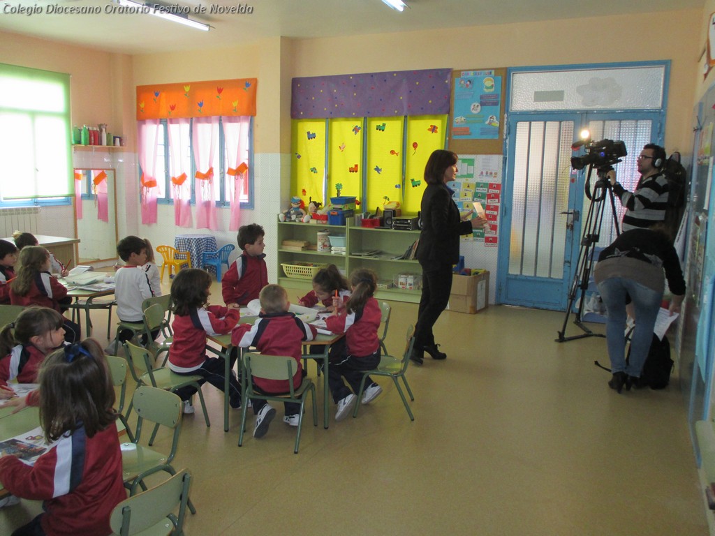 En las aulas de 4 años estamos trabajando la unidad didáctica: “Nos comunicamos”. Los alumnos están aprendiendo los medios de los que disponemos para comunicarnos: la radio, la televisión, el ordenador, la prensa, etc. El otro día en la clase de las nubes fue un día especial. Estábamos hablando de la televisión. En nuestro libro observábamos la imagen de un plató. Hablábamos de las cámaras, los focos, el presentador, el cámara… Y ¡sorpresa! se abrió la puerta de nuestra clase y apareció una presentadora y un cámara de verdad. Era la presentadora de Tele Novelda Ruth Campos y el cámara Rober. Vinieron a grabar una noticia con nuestra directora Patricia.